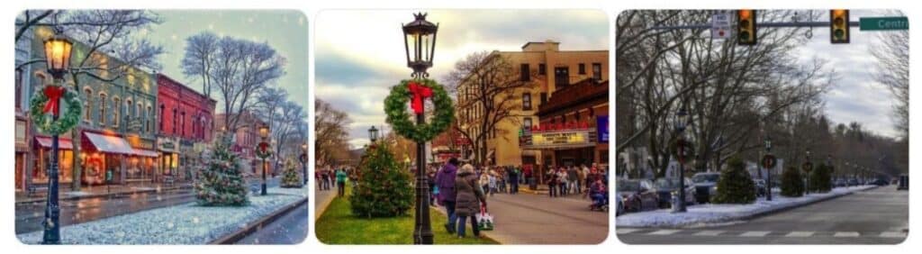 The soft glow of gas lamps combined with fresh snow and decorated storefronts creates a setting that feels tailor made for a holiday getaway along US Route 6.